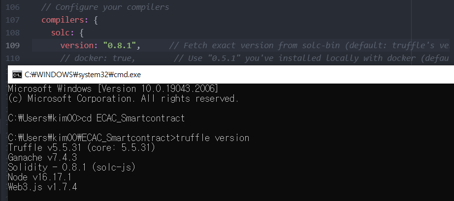 (6) truffle-config.js 의 compilers 버전 수정