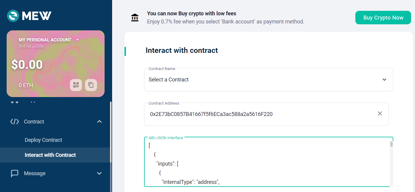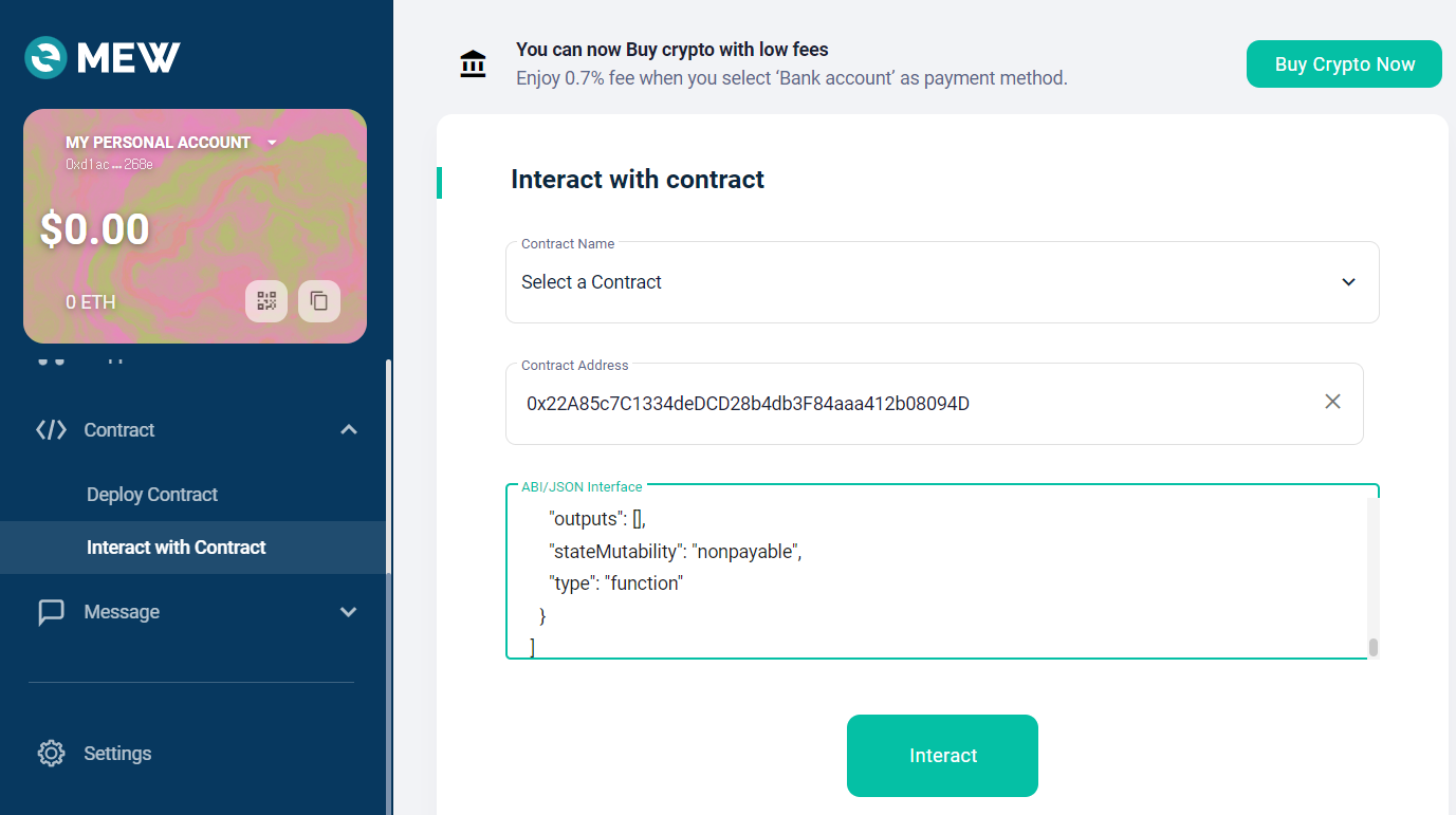 (2) MEW의 interact with Contract에서 스마트컨트랙트의 주소와 복사한 ABI 각각 입력 후 interact