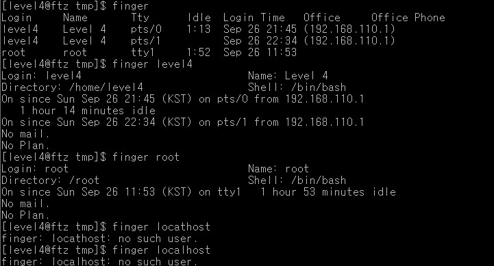 finger 명령어로 level4, root, localhost를 모두 해보았으나