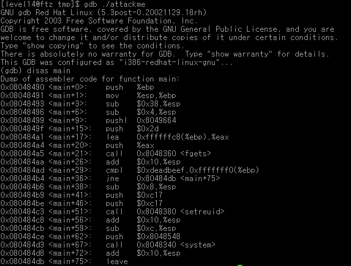 gdb 명령어로 attackme 파일을 분석하자.