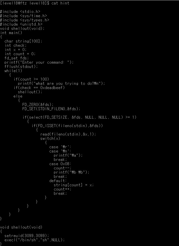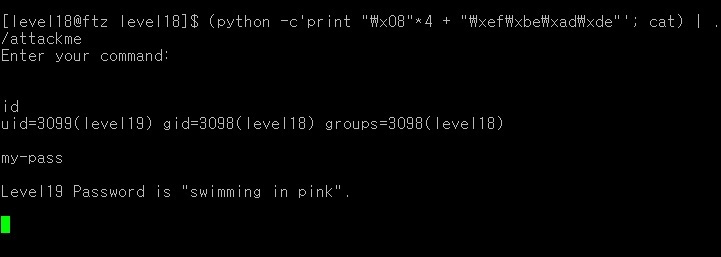 shellout 함수는 setuid 함수로 level19 권한으로 바꿔주며 배쉬 쉘을 실행시키는 역할을 한다.