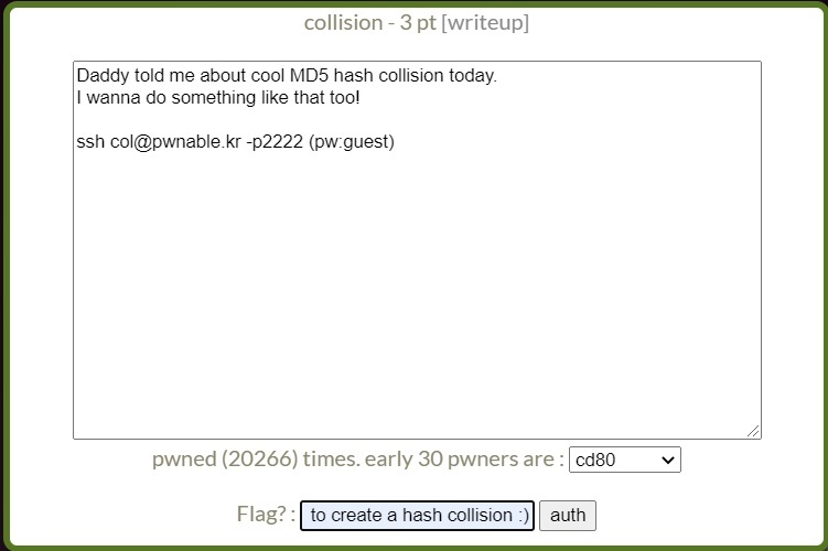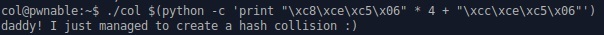 Collision의 flag는 "daddy! I just managed to create a hash collision :)"
