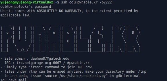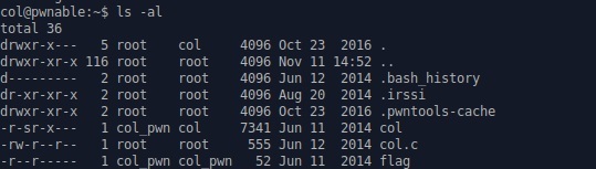 내 권한은 col 이므로 col 파일은 실행 / col.c 파일은 읽기 / flag는 아무것도 할 수 없다.