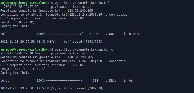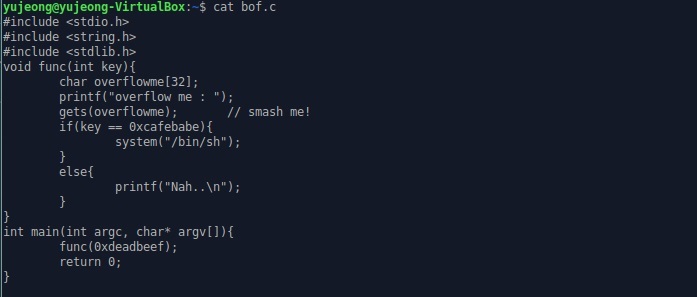 먼저 bof.c 파일을 읽어보면 func와 main 함수가 정의되어 있다.