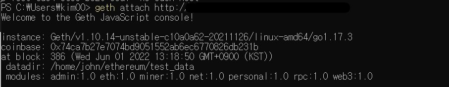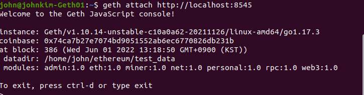 - geth가 localhost에 attach하면 로컬 컴퓨터에서도 접속이 가능한 상태에 진입