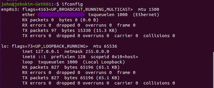 - GethUbuntu에서 ip 확인 > ip주소 출력 안됨