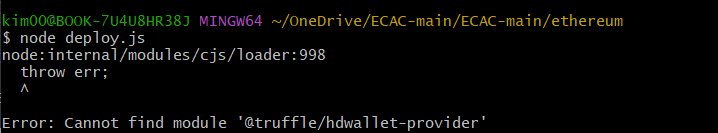I got the following errors while trying to deploy my smart contract: sers-Air:lottery user$ node deploy.js internal/modules/cjs/loader.js:582 throw err; ^ Error: Cannot find module 'tr...