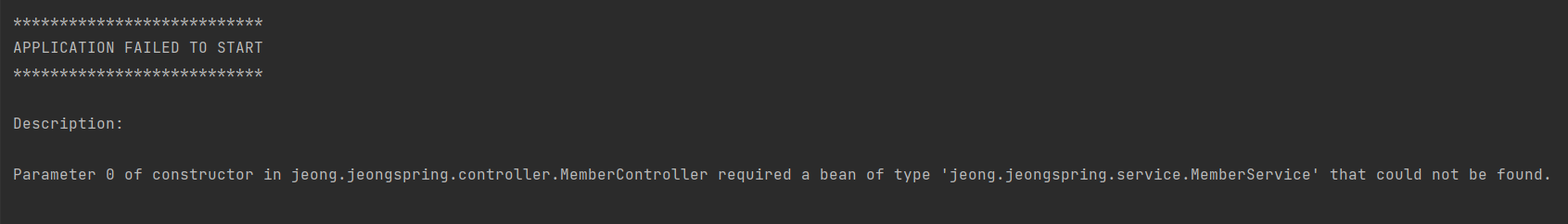 - @Service, @Repository 애노테이션을 지우고 다시 실행하면 오류 출력