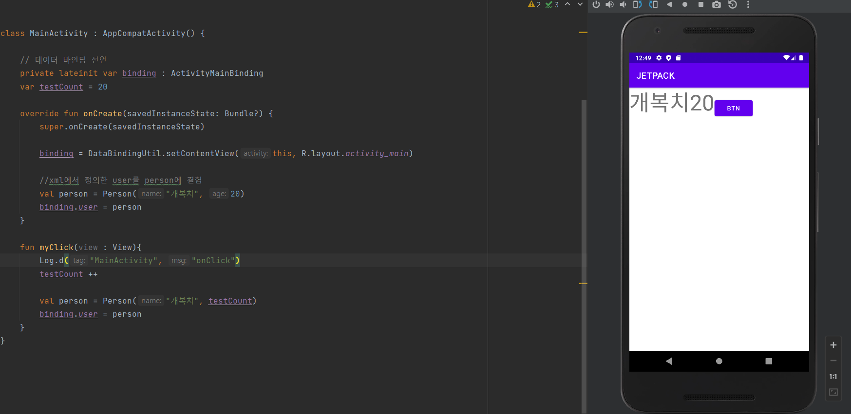 - Person 데이터 클래스 생성하고, xml 상에서 데이터 <variable> 세팅