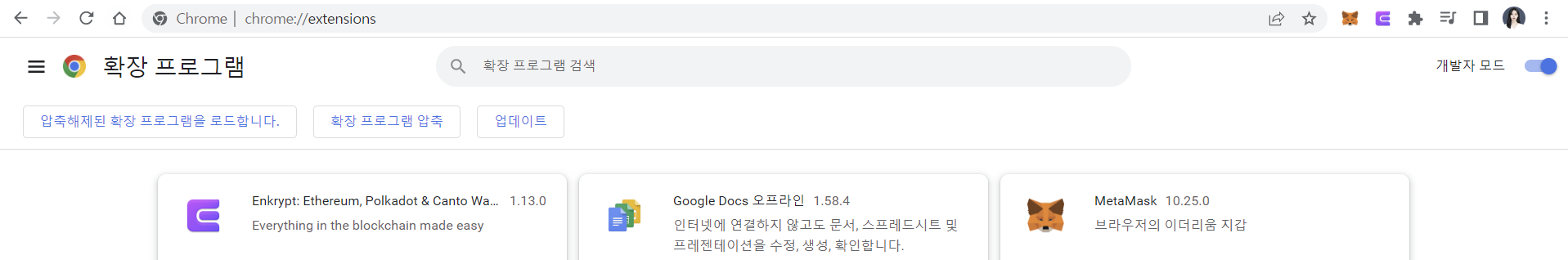 4. chrome://extensions에 접속하여 개발자 모드를 On하고 압축 해제된 확장 프로그램 로드