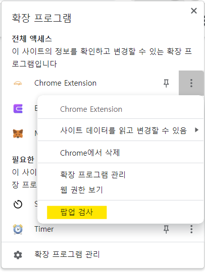 - 크롬 확장 프로그램의 popup.js 콘솔은 아래와 같은 방법으로 확인할 수 있다!