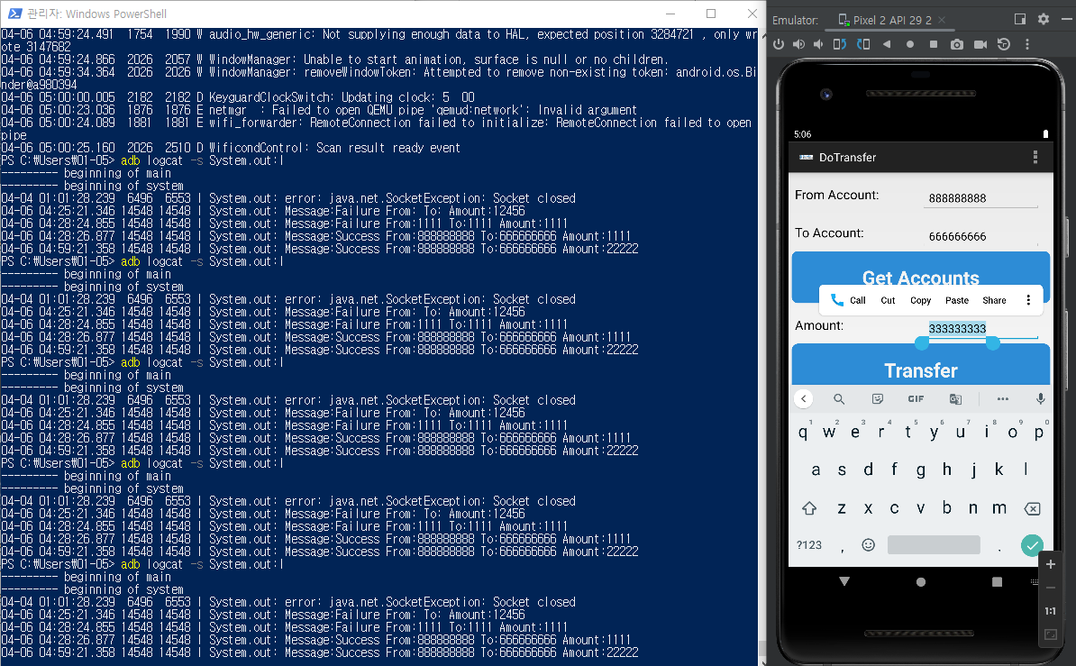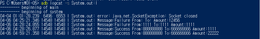 (1) 다음의 logcat 명령어를 PowerShell 상에서 수행하면 많은 수의 로그 메시지를 볼 수 있다.