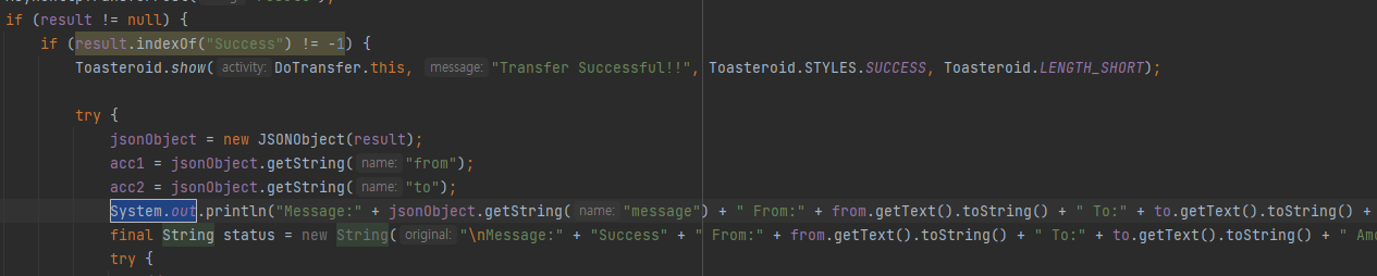 (1) 안드로이드 스튜디오 InsecureBankv2 프로젝트의 DoTransfer.java 파일에서 System.out 문을 찾는다. 특히 3.(3)번에서 출력되는 로그와 직접적으로 연관된 System.out 문을 찾는다. 해당 System.out문을 삭제하거나 주석 처리하면 방어할 수 있다.