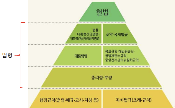 - 법령의 계층적 구조 : 헌법 → 법률 → 시행령 → 시행규칙 → 행정규칙