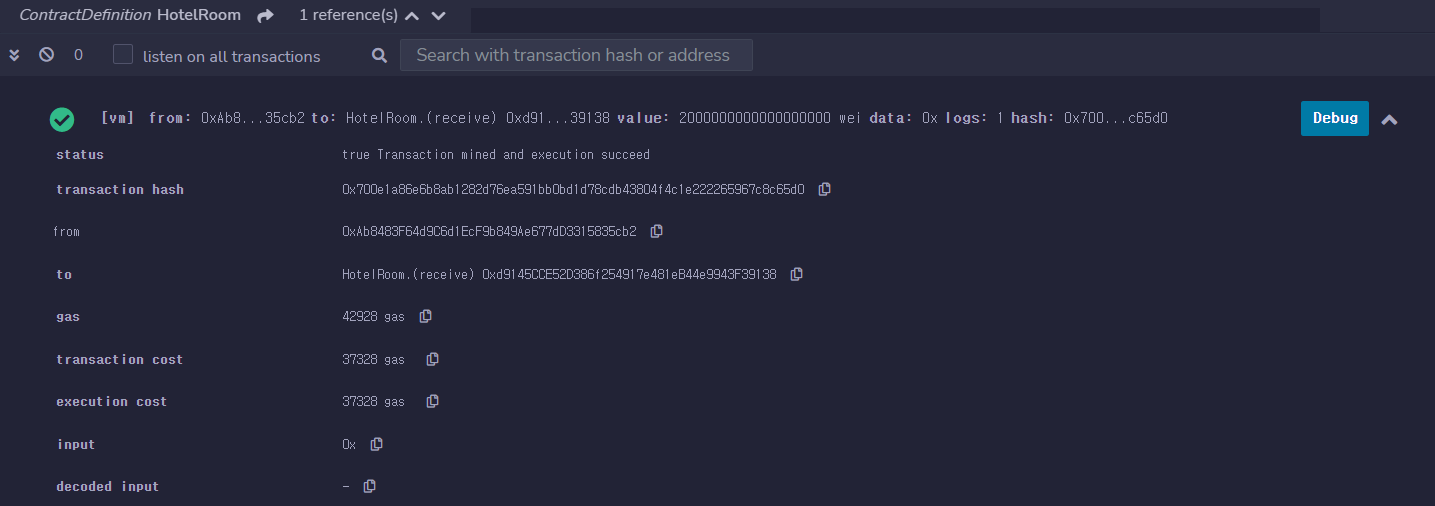 - 다른 계정으로 이더를 보내면 이미 호텔룸 예약이 이루어 진 상태이므로 오류메세지가 뜸