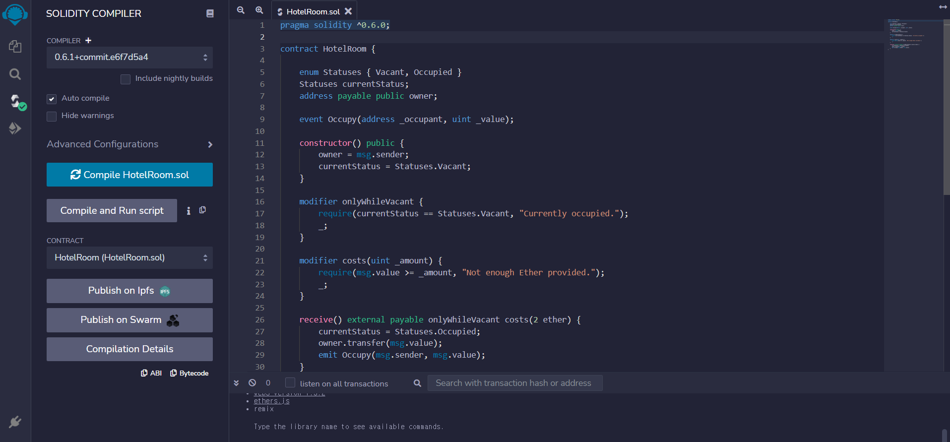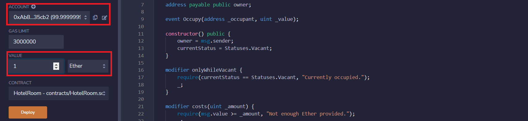 - 새로운 Workspace를 만들어 HotelRoom.sol 코드를 작성함