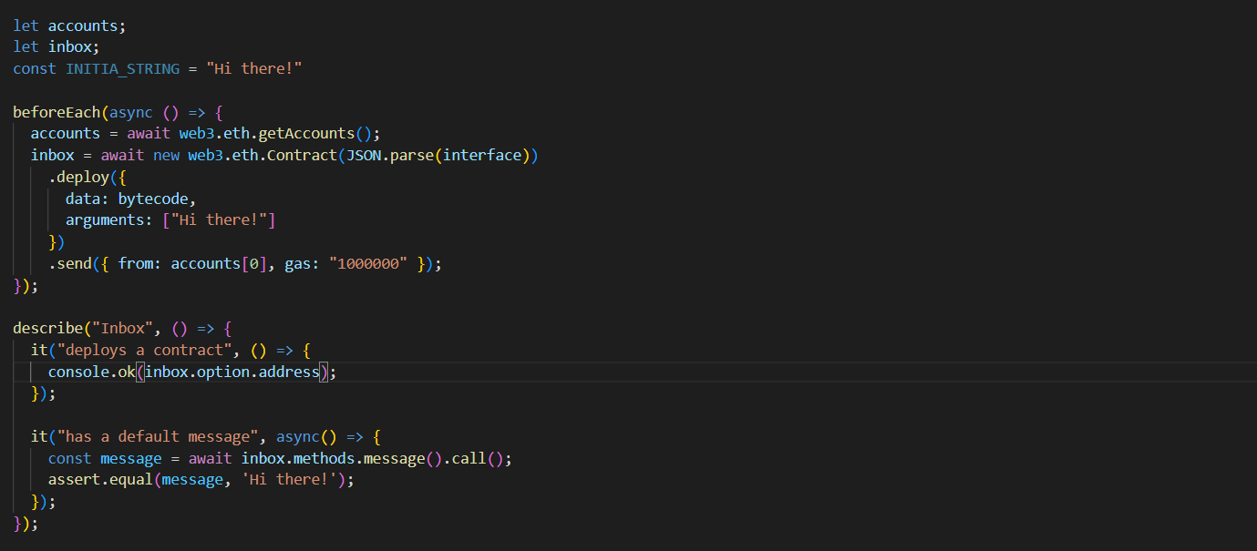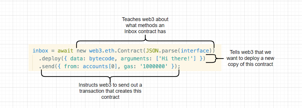 - send 라인에서는 계약을 생성하는 사람(from)과 gas 값을 명시