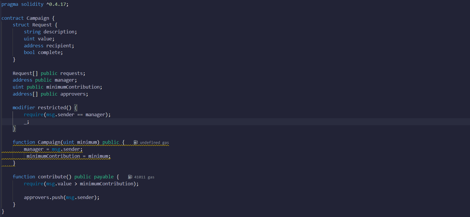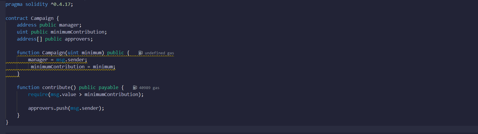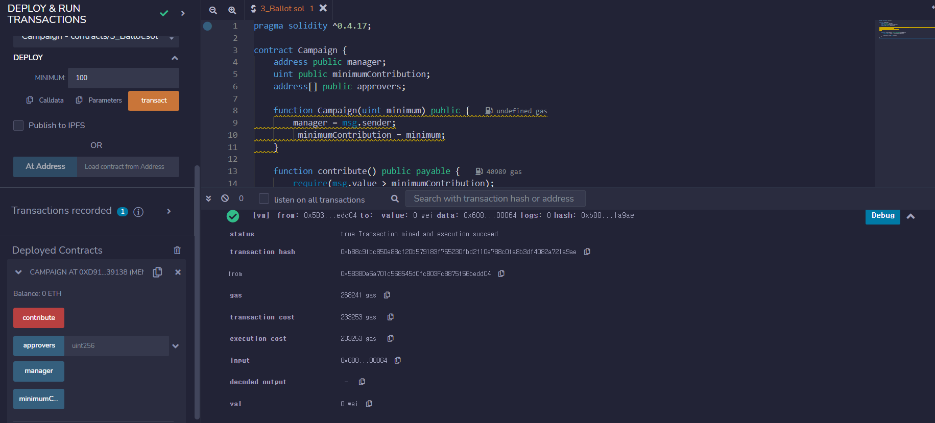 - Campaign: 생성자 함수, 게약의 최소 기여도와 소유자 설정