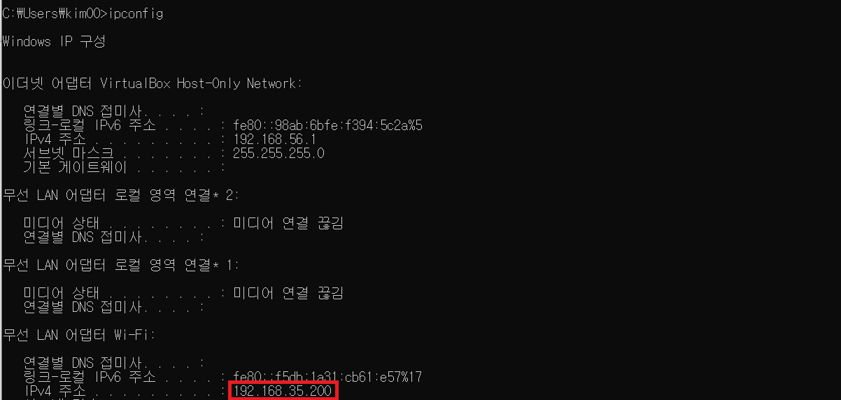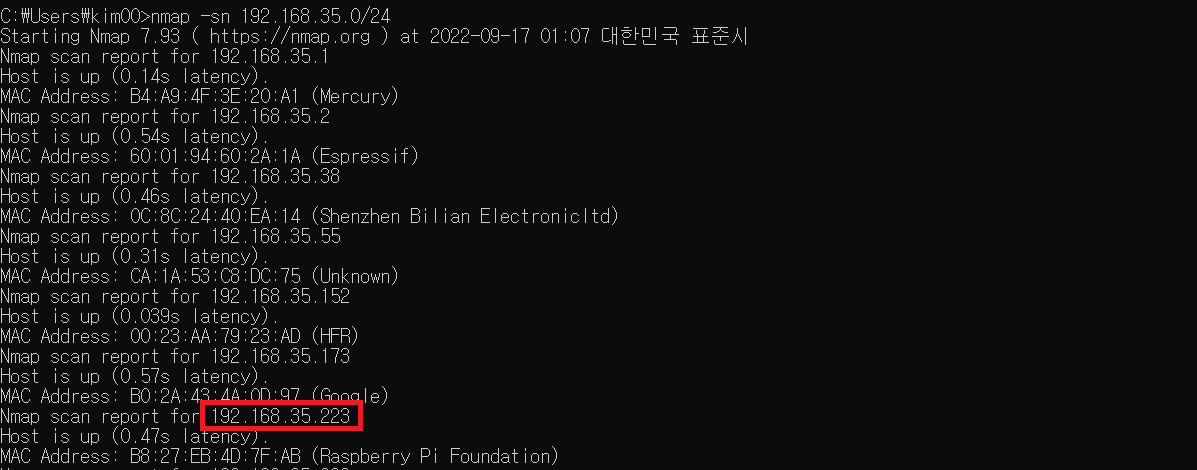 (3) 로컬의 cmd 창에서 라즈베리파이 ip주소 확인