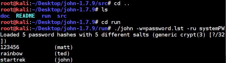 (3) john.pot 파일에 크랙킹 결과가 담겨있음