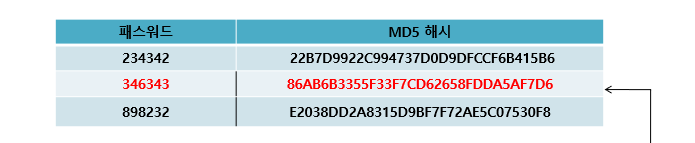 - 패스워드와 해시들의 체인들로 구성된 레인보우 테이블 이용해서 크랙
