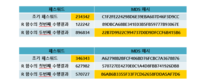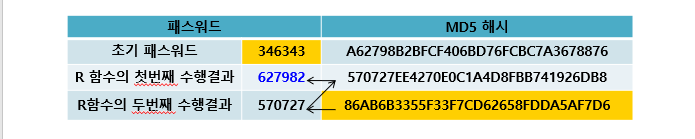 - R 함수 출력값 = MD5 해시값의 처음 6자리 수