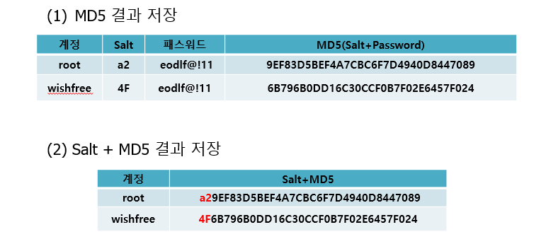 - Salt를 사용해서 패스워드 해시 또는 암호화의 안전성을 향상시킴