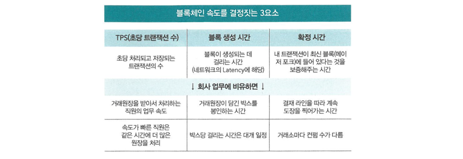 - 블록체인 속도 결정 요소: Transaction per Second, 블록생성시간, 블록생성확정시간